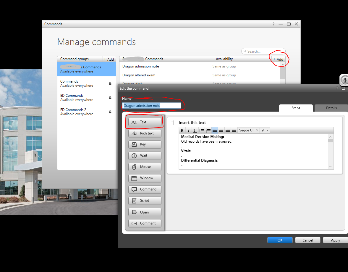 Once you log onto mModal you can make your own Macros and save them in this program. Choose a “catch phrase” that activates mModal to recognize you want a macro entered. My Catch phrase is “Drag in [x]”. I use a combination of the preformed ED Macros (found under ED Commands) and my own custom macros.