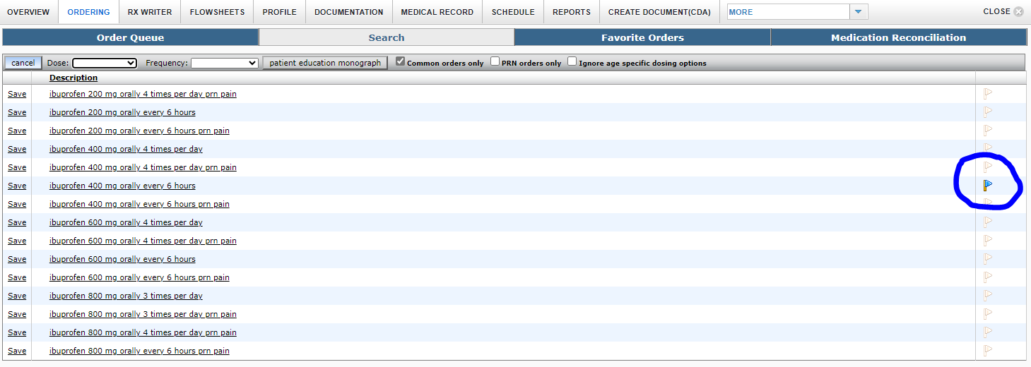 Within Paragon, you can set up your order favorites by first searching for an order or order-set, then clicking on the Blue flag on the right-hand side of the screen.