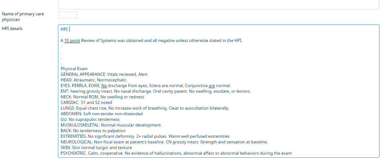 STEP 3: In this section we put the HPI, review of systems, and physical exam. The M*Modal command that is already set up for this part of the note is called “Insert ED Adult Exam”. Use this command to get a template