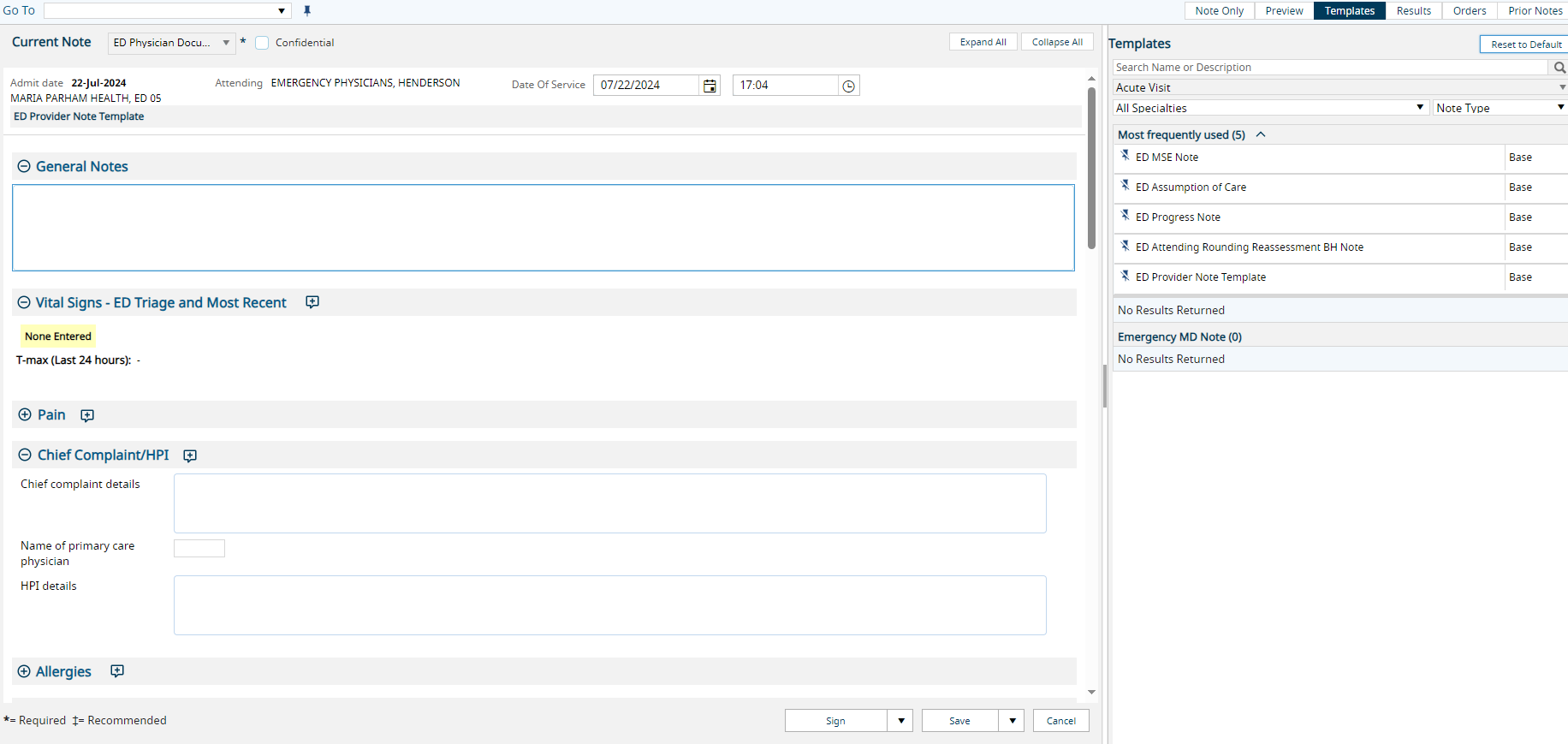 STEP 2: The next step is to look to the top right and you will see “note only’ “preview” “templates”. Please click on templates. you can then search for the templates I have selected in the top right corner. You can then pin them to your templates bar. These are the important notes that we use every day. The most common template is ED provider note template. The ED progress note, and ED assumption of care note are the 2nd most common. Please use these when you get a patient in sign-out.