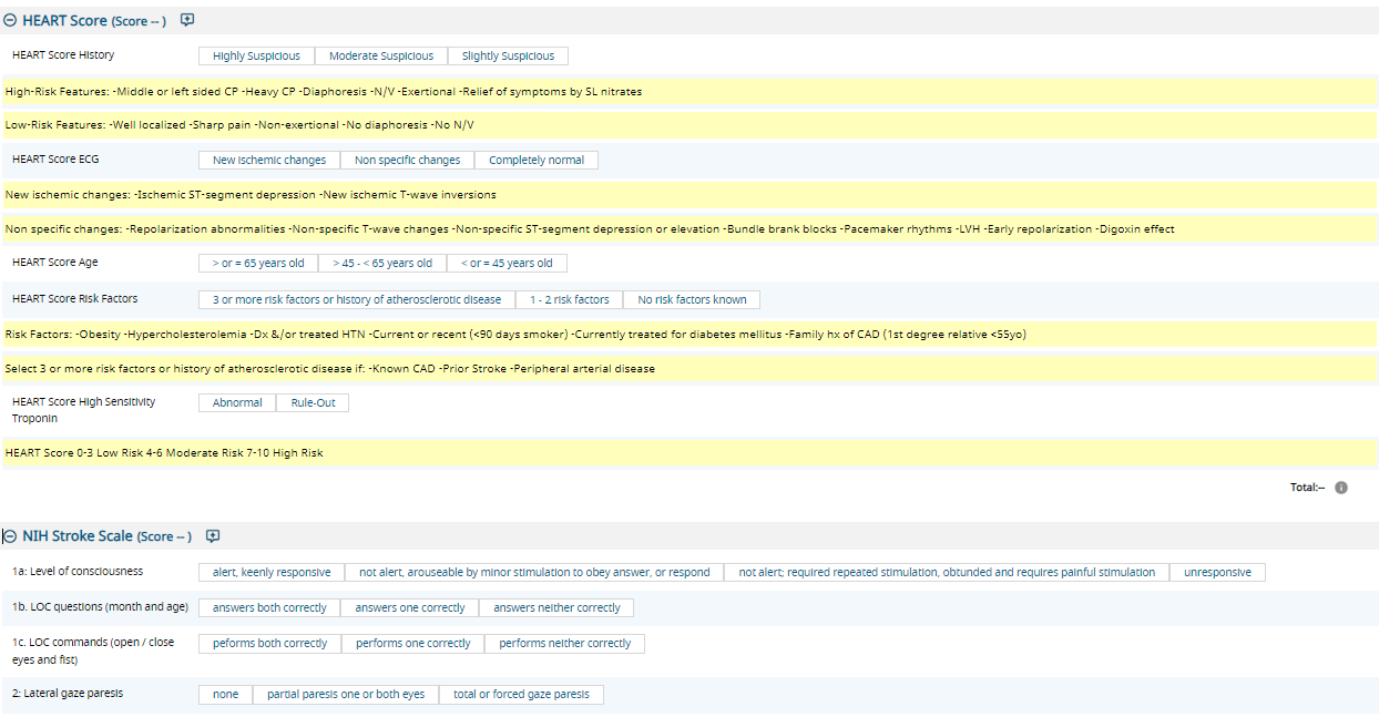 STEP 4: It is important to fill out your heart score and your NIH stroke scale when you have patient’s that fall into this category. Any shortness of breath and any chest pain requires a heart score. Any stroke-like symptoms requires an NIH stroke scale