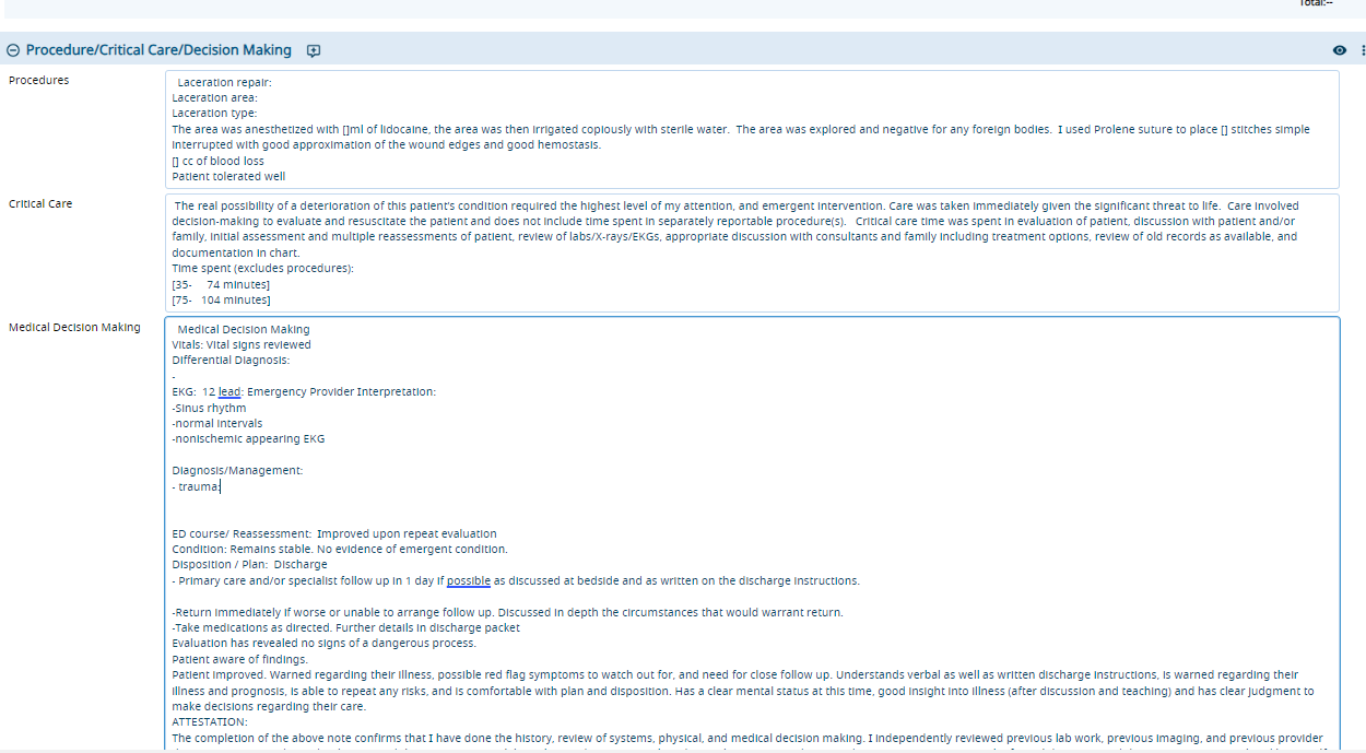 STEP 5: It is important to list any procedures you do in the procedure section, list any critical care that is done in the critical care section, and discuss your medical decision making. The M*Modal command for critical care is “Insert ED Critical Time”. The commands for each procedure are specific to that procedure.